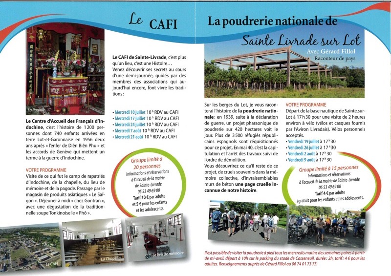 Durant l’été, de nombreuses visites sont organisées à Sainte-Livrade. Il est notamment possible de visiter le CAFI, avec les membres de l’ARAC et le site de la Poudrerie avec Gérard Fillol, raconteur de pays.