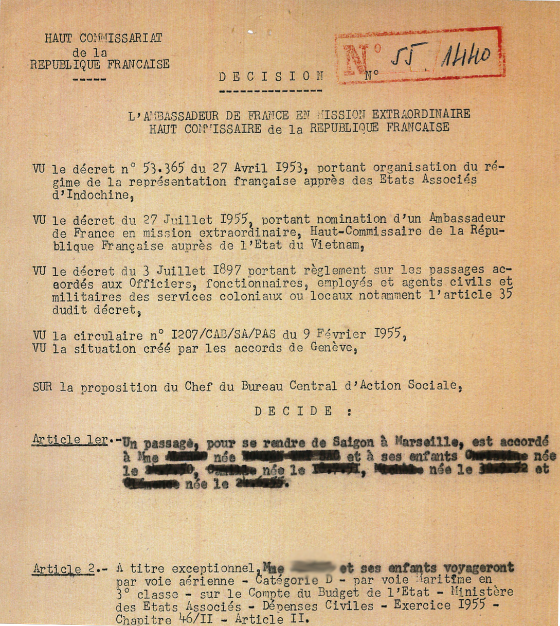 On se soucie ensuite des familles françaises, souvent eurasiennes, dépourvues de moyens, restées attachées à la France, ayant travaillé pour la France et se sentant « en danger politique » : Indochinois, Eurasiens issus d’unions mixtes, Indiens des comptoirs (Pondichéry) établis en Indochine, Cambodgiens, Laotiens. Il y a une forte proportion d’enfants et de femmes, veuves ou restées seules après le départ des Français. Ces familles sont nombreuses, souvent élargies et ne voulant pas être séparées. Le rapatriement doit être demandé par les chefs de famille. Le cas de chaque famille est étudié. Certains acquièrent à cette occasion la nécessaire nationalité française. On se préoccupe aussi du départ des enfants de la FOEFI et des enfants de troupe de Dalat .