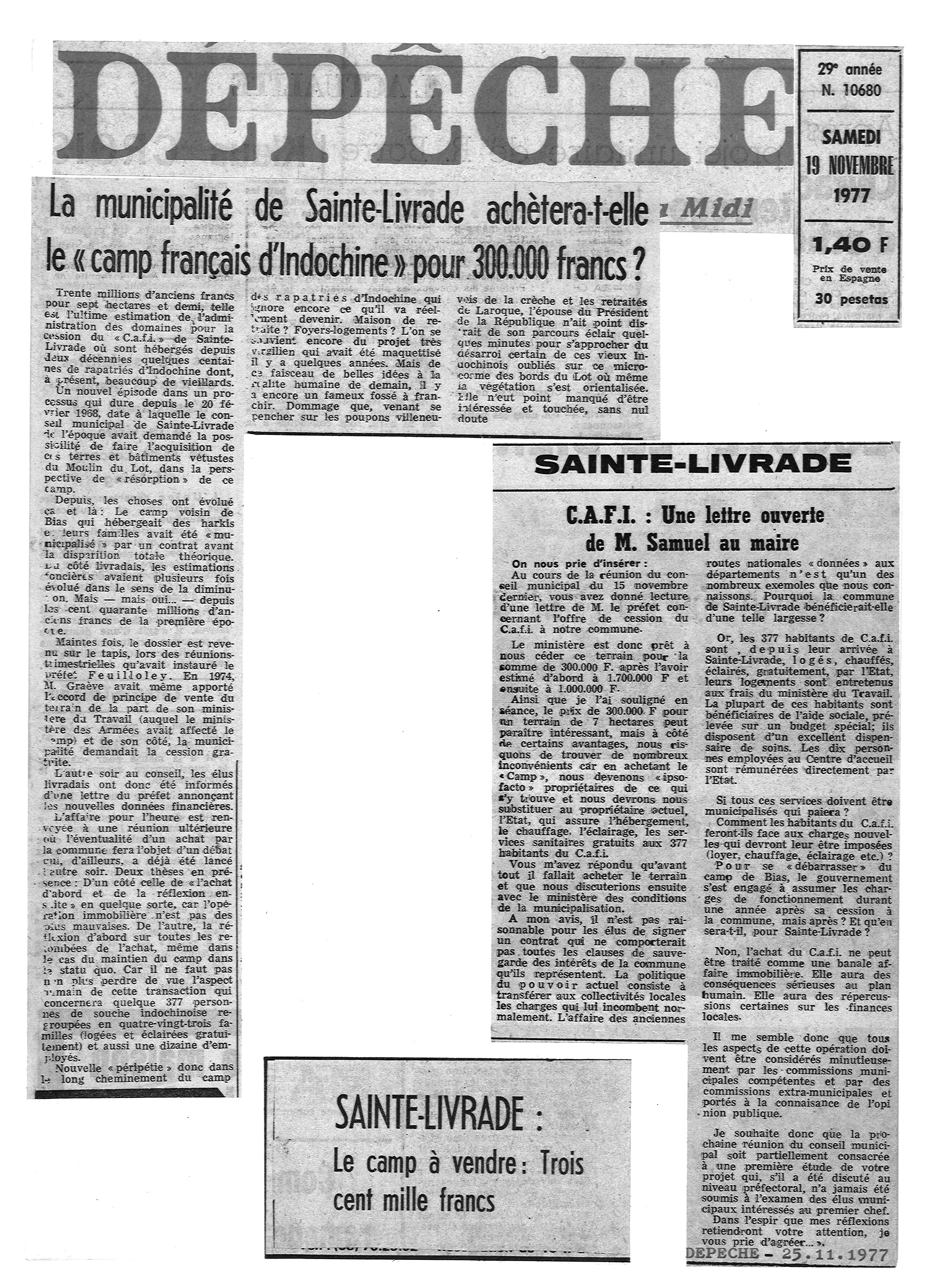 Le 1er février 77 le Conseil Municipal de Sainte Livrade donne un avis favorable pour achat (20 500 francs) des quatre bâtiments du « Camp des Espagnols » qu’elle loue à l’Etat depuis 1950. Ces bâtiments seront détruits (en octobre 80 les habitants sont relogés au CAFI) pour laisser place à de nouveaux logements sociaux, « la cité du Moulin du Lot ». Les nouveaux logements, livrés en 1985, sont réservés en priorité aux résidents du CAFI. Particularité culturelle, chaque appartement comporte une alcôve susceptible d’abriter un autel à Bouddha ou aux ancêtres. Cependant, l’affluence n’est pas telle qu’espérée. Si quelques personnes, enfants de rapatriés surtout, s’y installent, peu de femmes âgées y emménageront et certaines feront le choix inverse du retour, préférant les baraquements inconfortables mais au cœur de la communauté plutôt que les logements modernes mais à distance des amis et voisins.Ces quatre bâtiments n’étaient pas partie intégrante du CAFI mais on assiste toutefois à un début de réhabilitation du quartier.