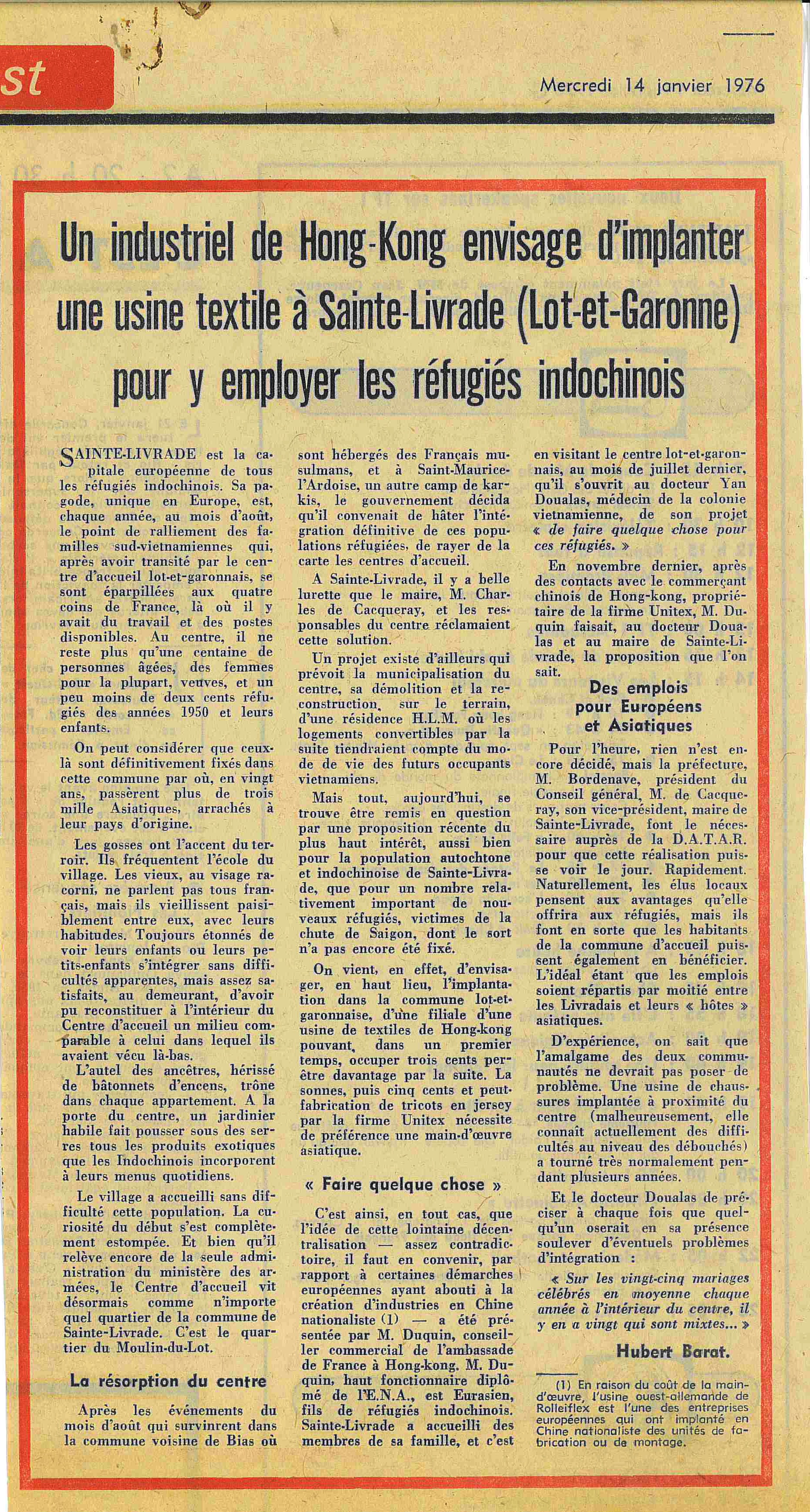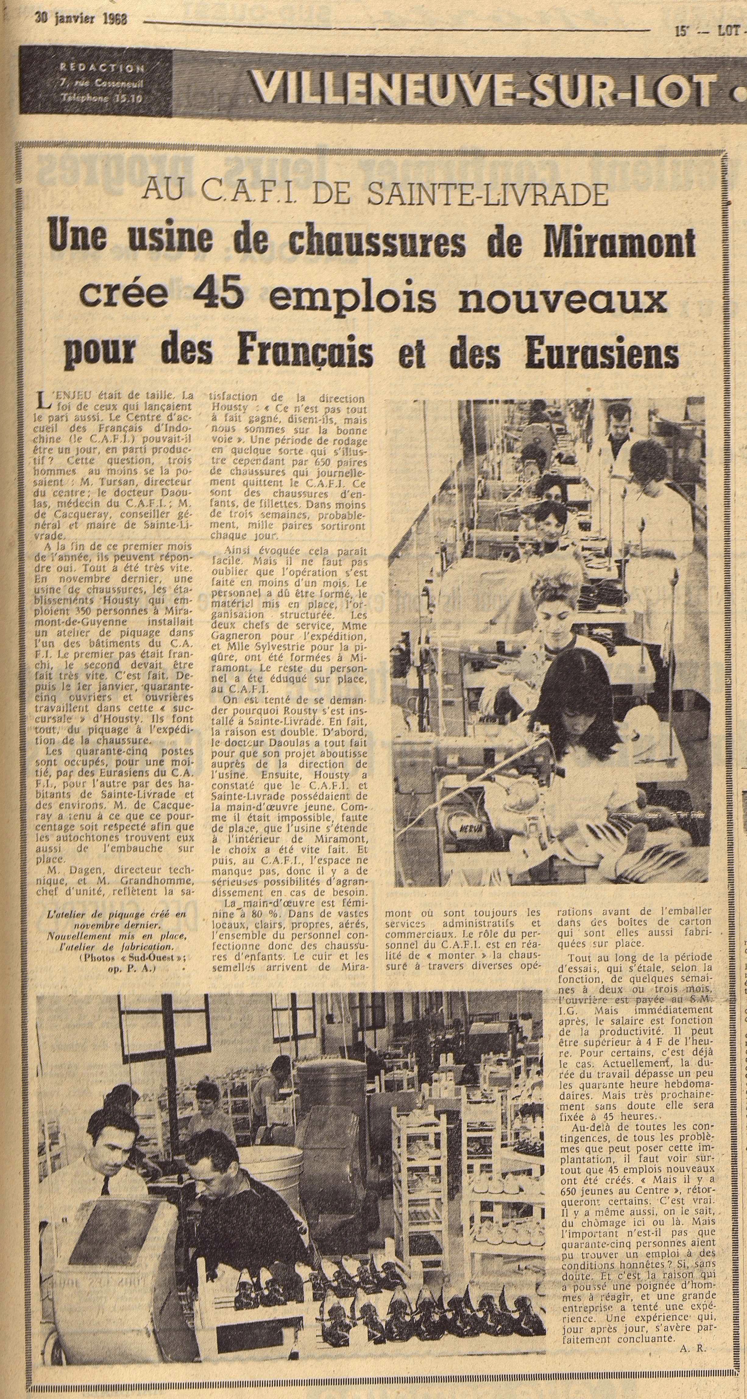 En-dehors du secteur agricole, deux initiatives témoignent aussi de la volonté de rapprocher les populations indochinoises et européennes par le travail.En premier lieu, en 1956, la recommandation d’employer « au moins un Indochinois » dans les entreprises locales. Une mesure qui semble avoir été appréciée et a favorisé les contacts comme l’évoque cet homme à propos des Indochinois dans l’entreprise de construction où il travaillait: « Delbigot avait employé ces gens comme magasiniers. Je les ai côtoyés, je suis allé chez eux. C’était des gens d’une courtoisie ! On sympathisait vite ». En 1966, sous l’impulsion du médecin du dispensaire, le Docteur Daoulas, l’usine de chaussures Housty de Miramont-de-Guyenne installa un atelier de montage de chaussures dans les salles de classes désaffectées du CAFI. Un second atelier ouvrit en 1973. Cette activité concernait 85 personnes, dont 30% d’Eurasiens (en 1972 on reproche cependant à l’établissement de ne pas faire travailler les effectifs de rapatriés prévus). Cette répartition permit la cohabitation par le travail des Indochinoises et des Européennes (les femmes y étaient en très forte proportion). L’atelier fonctionna sur ce modèle pendant une dizaine d’années puis disparut dans la tourmente économique en 1976. Un courrier du 23 mars annonce la fermeture de l’atelier pour revers commerciaux et nécessité de restructuration.Toutefois, ces initiatives ne doivent pas cacher des difficultés, des échecs même, devant certaines propositions de travail. La confection de tresses, la broderie ou le paillage par exemple n’eurent guère de succès du fait de conditions de travail et de rémunération peu satisfaisantes. A ces causes matérielles, s’ajoute la déqualification importante subie par certains rapatriés qui n’acceptent pas les travaux manuels alors qu’en Indochine ils occupaient des emplois de maitrise. Les femmes n’acceptaient pas non plus les emplois de gens de maison.
