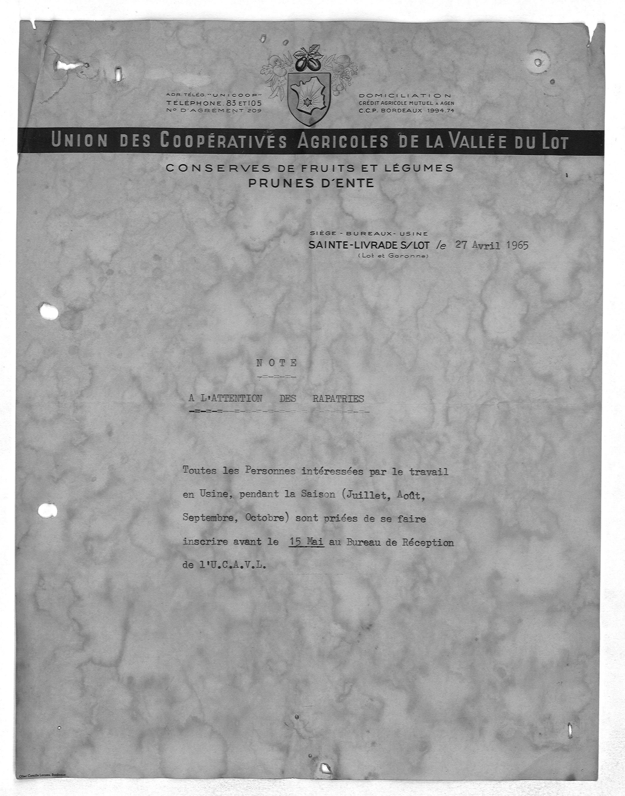 1965 : L’UCLAV recherche des travailleurs saisonniers