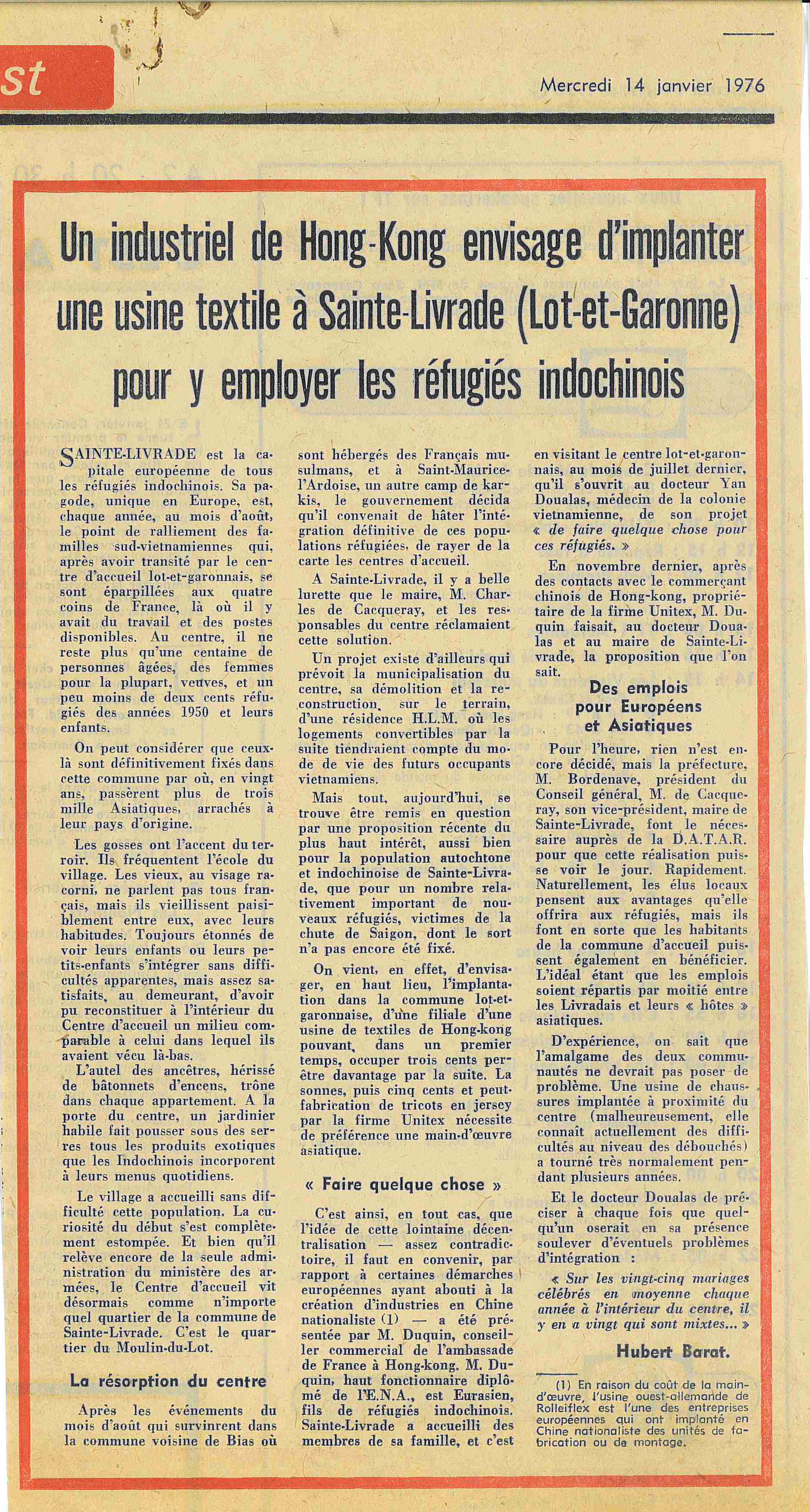 Janvier 1976 : Article de presse relatant le projet d’ouverture de l’usine Unitex