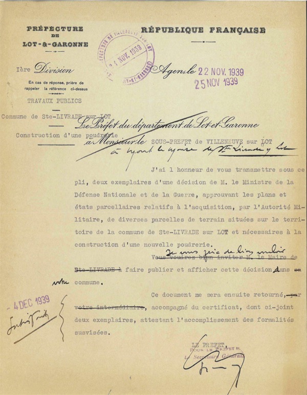 Novembre 1939 : Courrier du préfet du Lot-et-Garonne annonçant la réquisition des terrains par l’armée