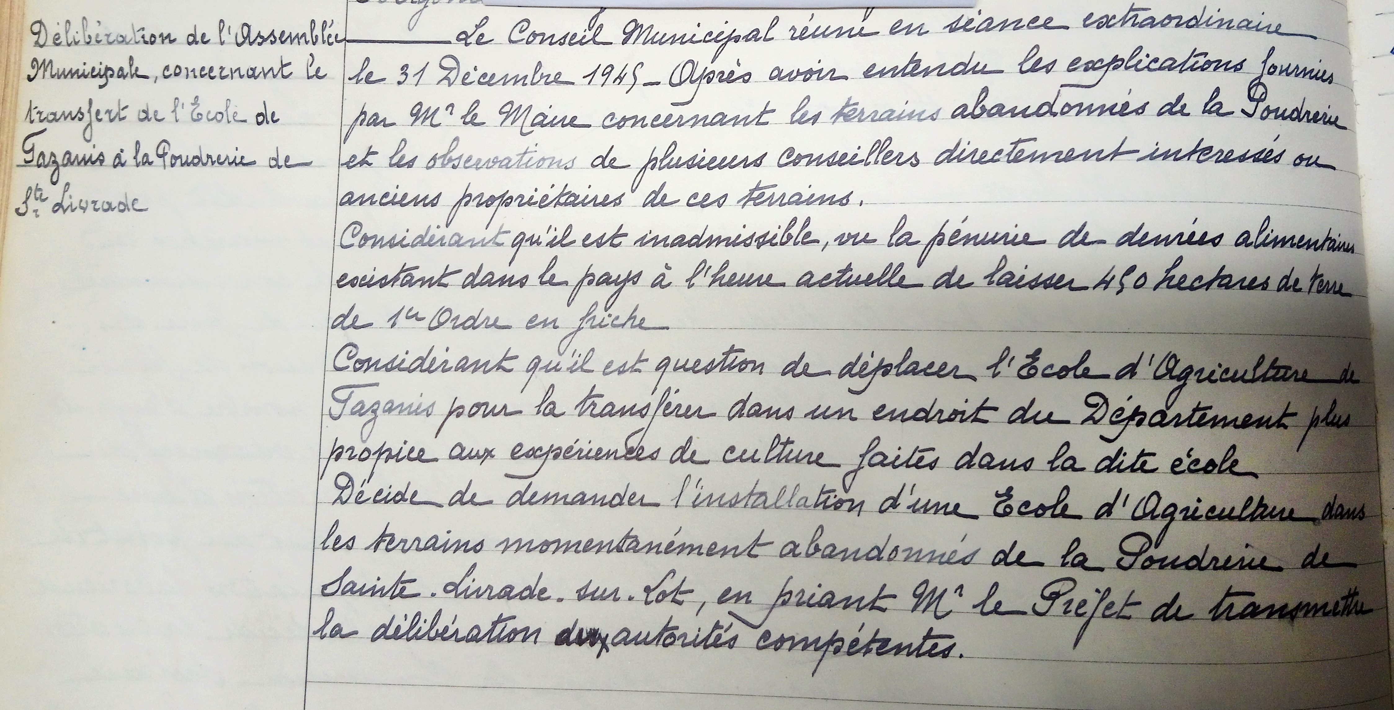 1946 : la municipalité se plaint que les terres de Poudrerie reste en friche et demande la création d’une école d’agriculture