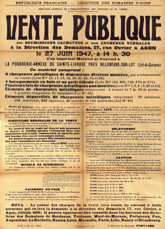 Juin 1947 : vente publique du matériel de Poudrerie. Une autre vente se tiendra en décembre de la même année