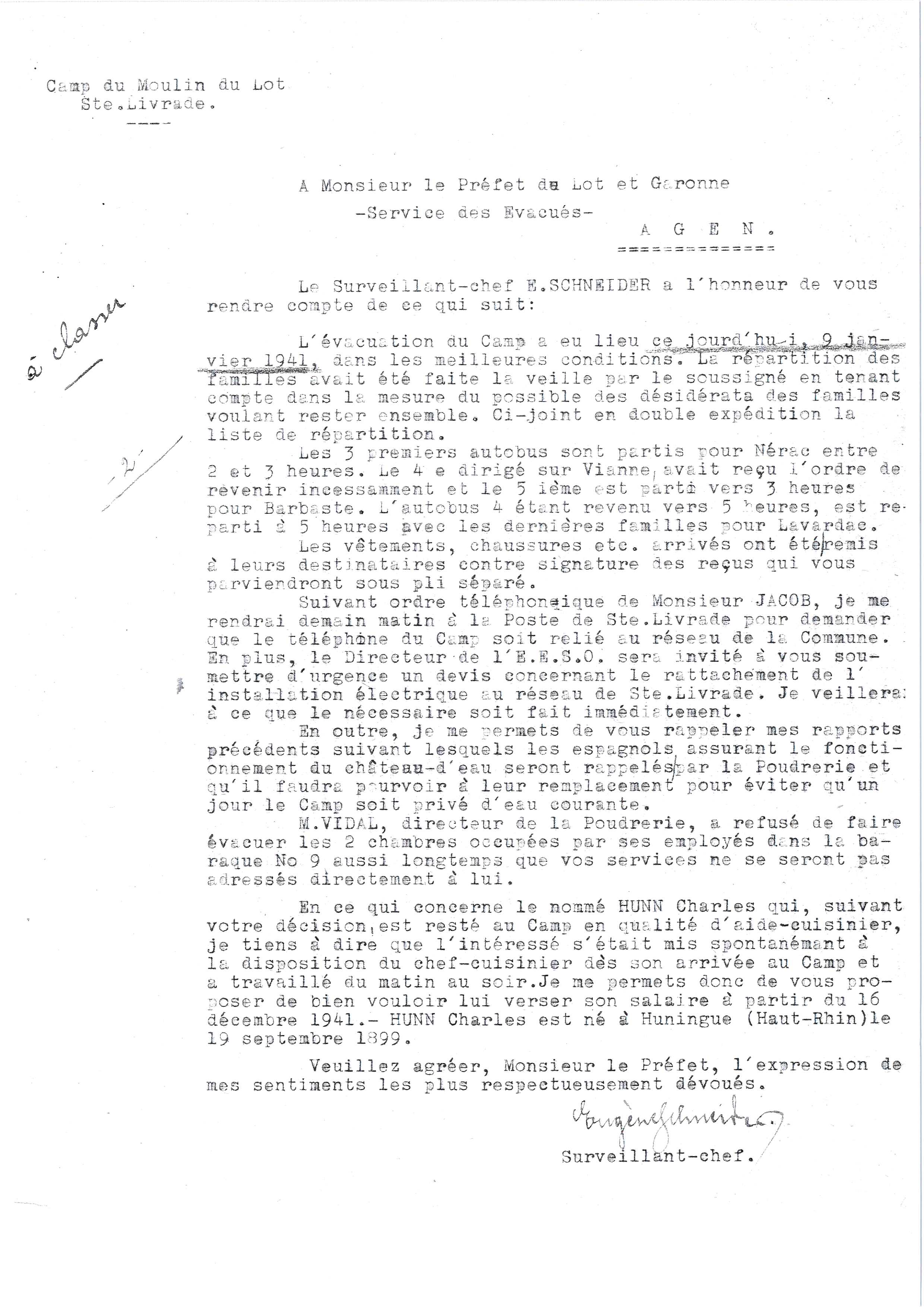 Rapport du surveillant chef du camp au Préfet du Lot et Garonne, départ des réfugiés le 9 janvier 1941