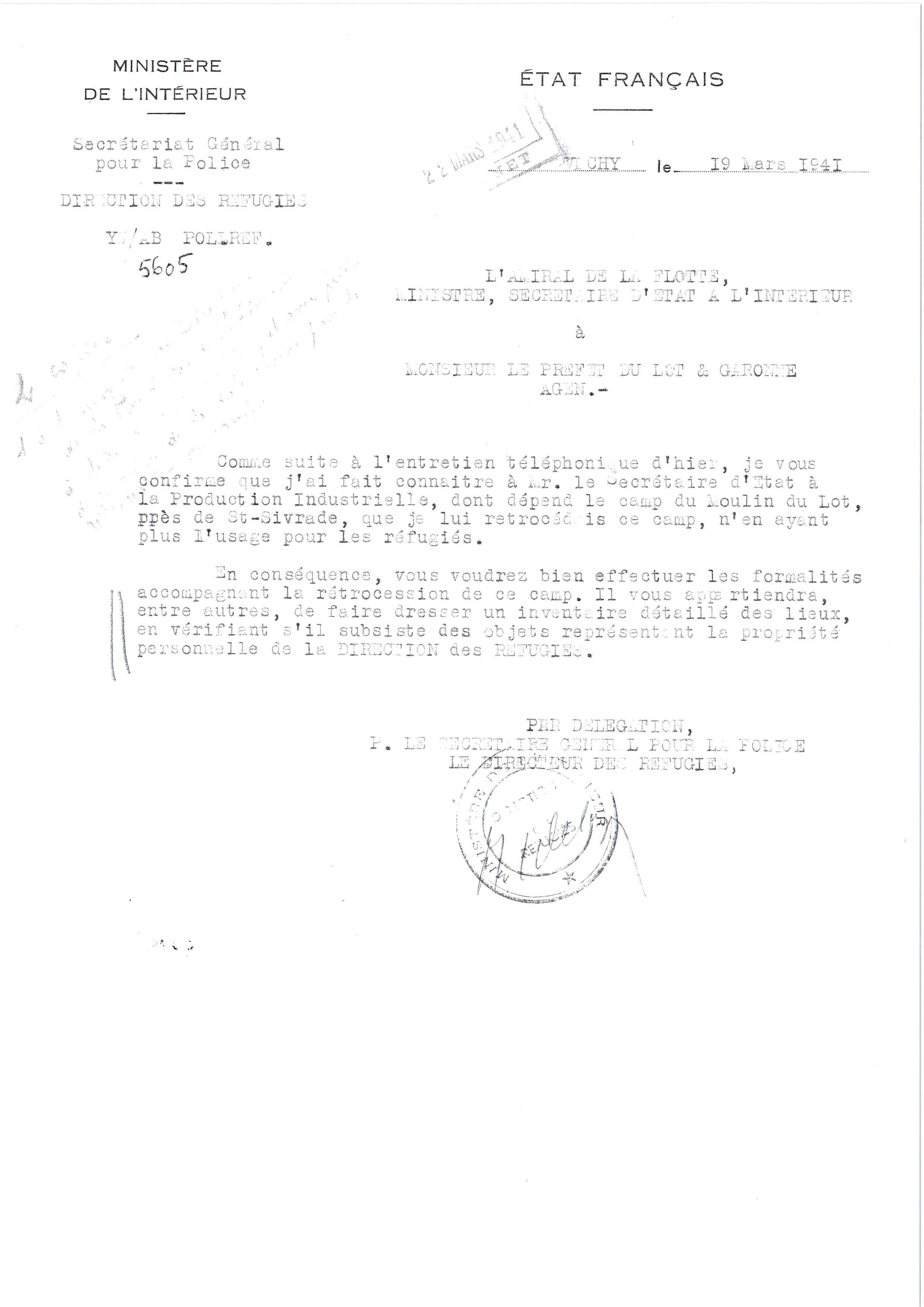 Courrier du Ministrère de l'Intérieur au Préfet du Lot et Garonne/ Rétrocession du camp qui n'accueille plus de réfugiés