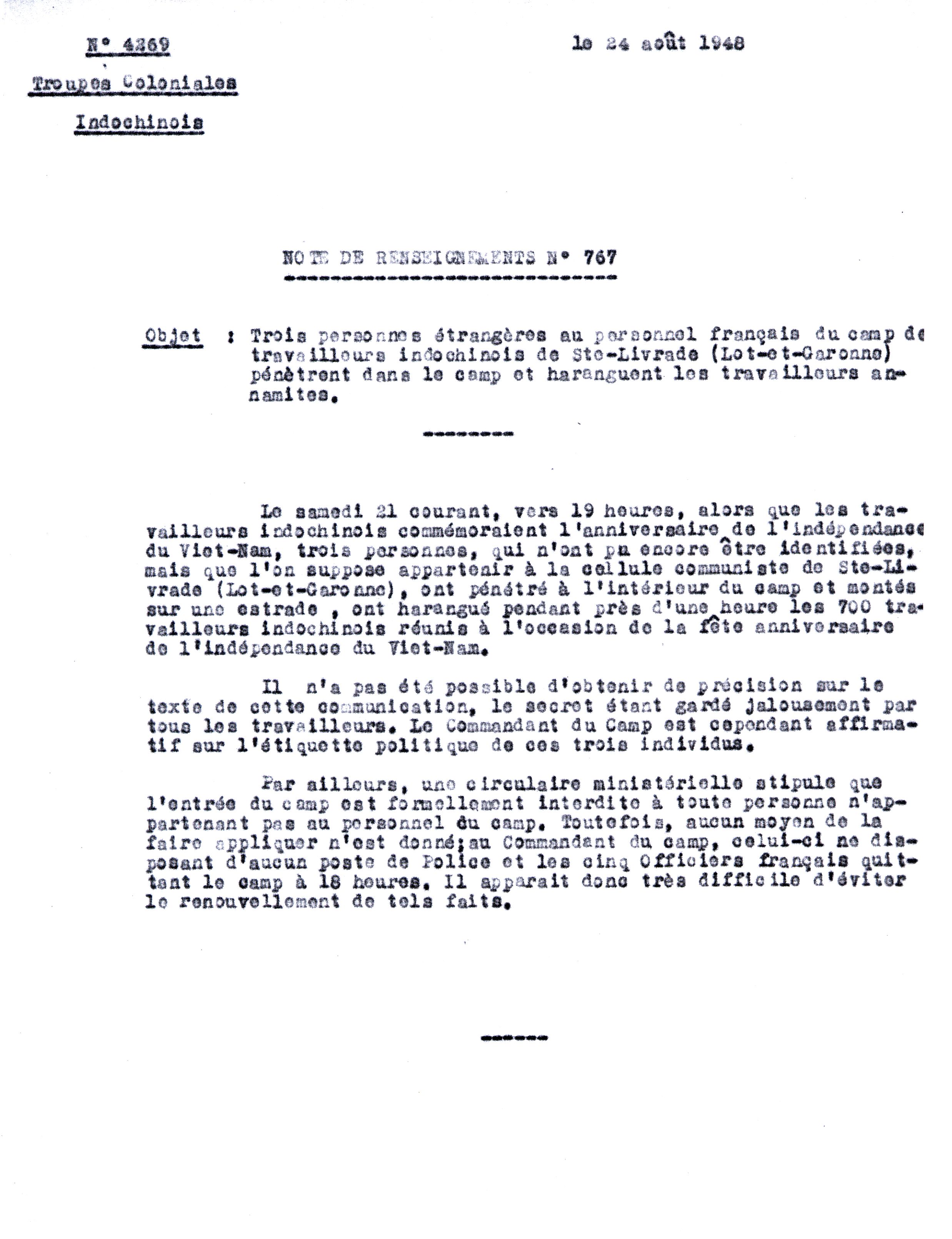 Note de renseignements : Des personnes étrangères au camp (communistes ?) font un discours auprès des 700 travailleurs indochinois